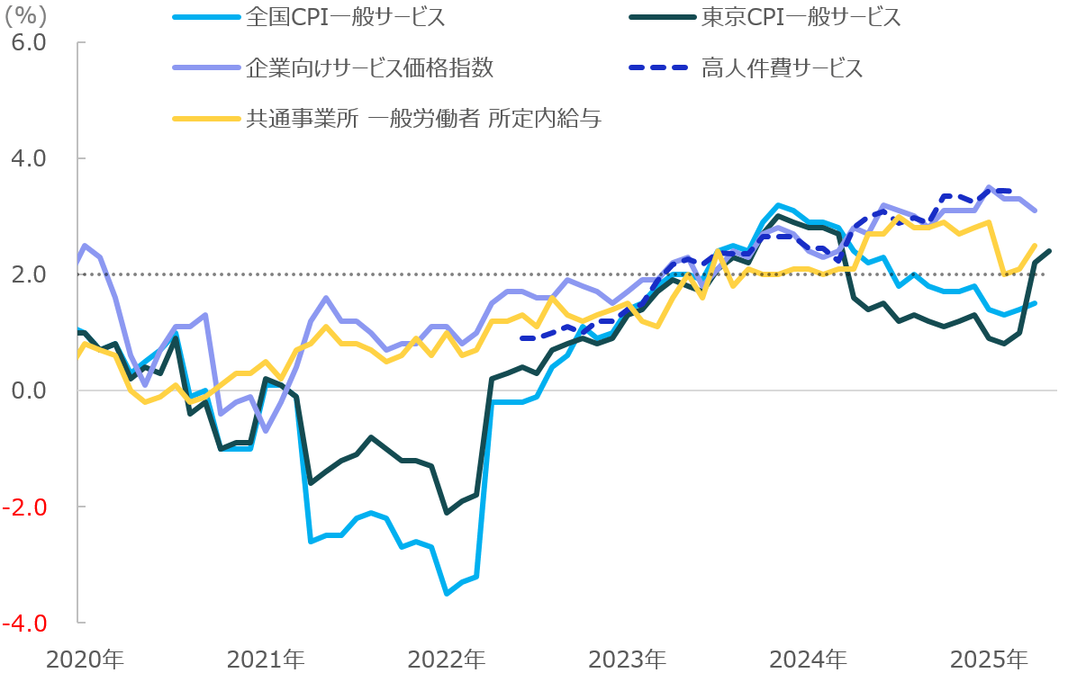 ここ数ヶ月の実質賃金を低下させているインフレは、コメを中心とした食料が主因となっていますが、足元ではサービス関連の物価指標が、日銀がターゲットとする2%の周辺で堅調に推移しています。上述の通り、一部の産業においては賃金の出遅れが見られますが、全体としての企業向けビジネス・消費者向けビジネスそれぞれのサービス物価は堅調です。そのことからも賃金への波及が予想され、この点では2026年の賃上げもある程度の水準が期待できるでしょう。