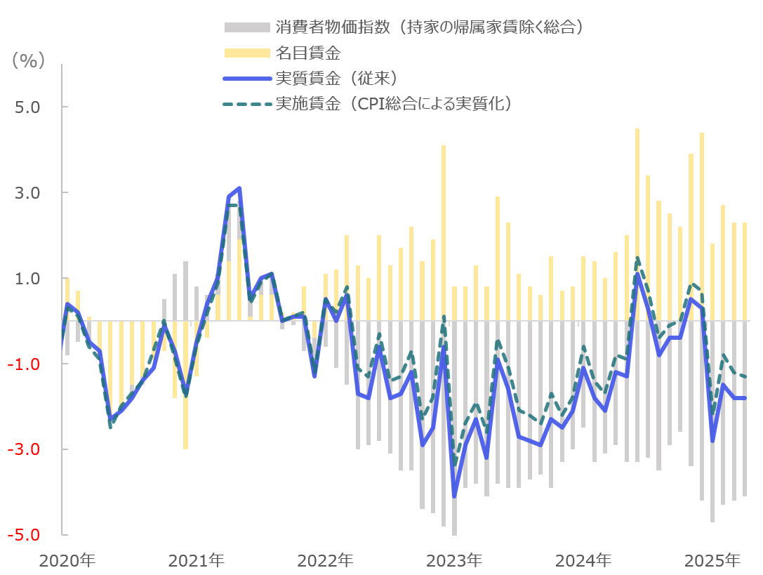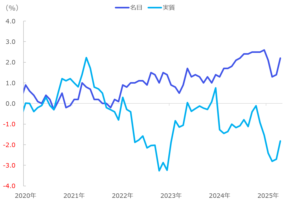 【1】結果:所定内給与は改善が見られるも実質賃金は4ヶ月連続でマイナス