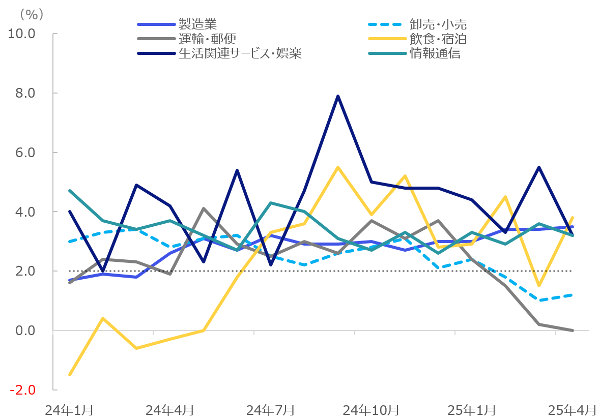 一般労働者の個別の産業に目を向けると、運輸・郵便や卸売・小売といった一部の産業において出遅れが確認されます。シクリカルなセクターであることから業績に準じて、給与の伸びが減速することが考えられるものの、これらの産業は人手不足が指摘されることもあり、人材獲得のためには給与を魅力的な水準にする必要があると考えられます。