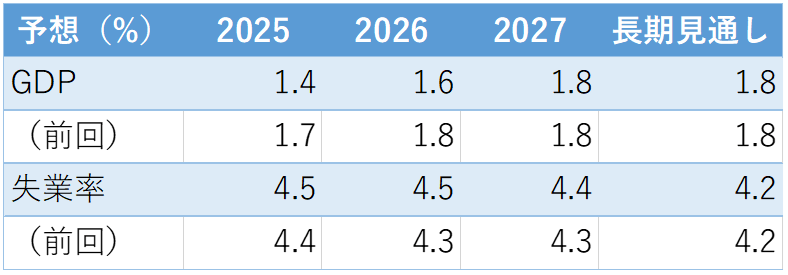 今回は3ヶ月に1回の経済予想が示されています。前回3月時点の予想と比べてGDPは下方修正、失業率は上方修正と景気認識が下方修正されました。