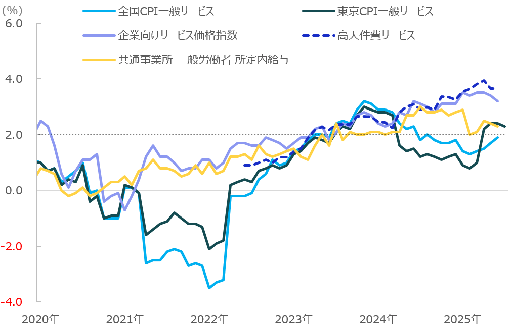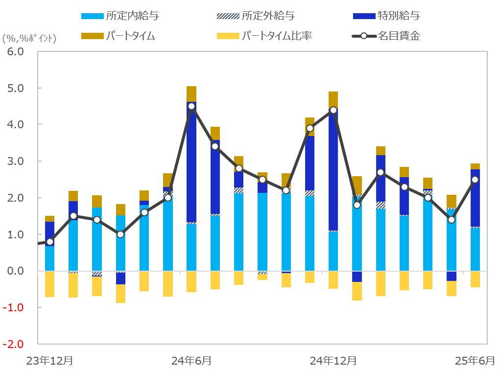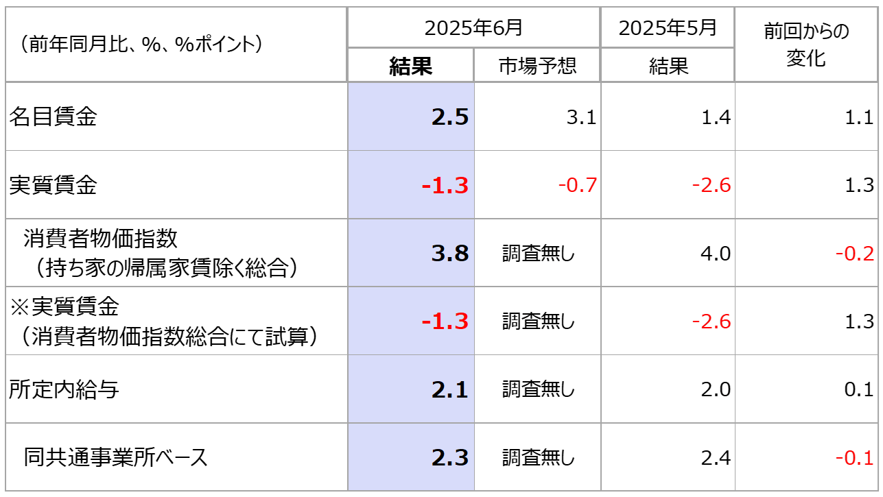 2025年6月の名目賃金は、前年同月比2.5%増し、前回5月(改定値)から上昇しました。市場予想には届かず、ボーナスに該当する特別給与が2024年6月の同7.8%増から減速となる、同3.0%増となったことが主な要因です。一方、基本給にあたる所定内給与は、同2.1%増と前月(改定値)からわずかに伸びが加速しました。サンプル替えの影響を除いた共通事業所ベースの所定内給与も、0.1ポイントの減速はあったものの、2%を超える底堅い結果となりました。