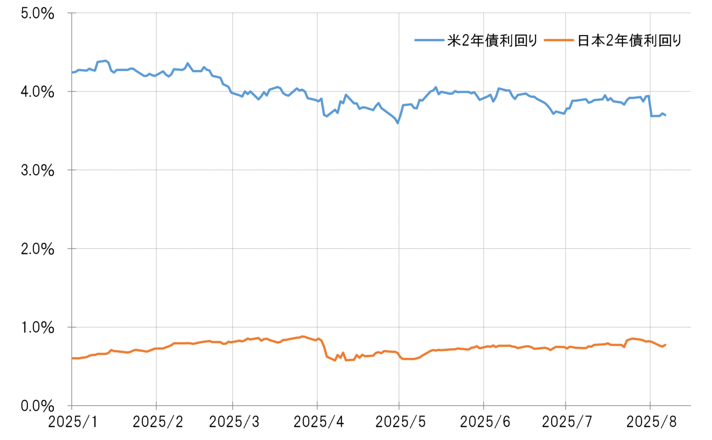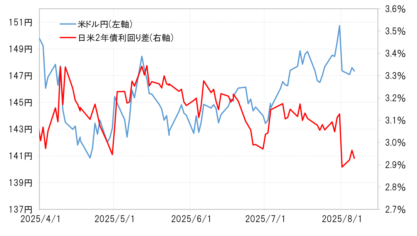 ではなぜ、日米金利差縮小は、今週(8月4日週)に入ってからは一服したのだろうか。その主因は、「雇用統計ショック」で起こった米金利の急低下が一服したことだろう。金融政策を反映する米2年債利回りは、雇用統計が発表される前の3.9%台から、発表後は一気に3.7%割れ近くまでと0.2%以上の大幅な低下となったが、今週は下げ渋りが目立つ展開が続いた(図表2参照)。
