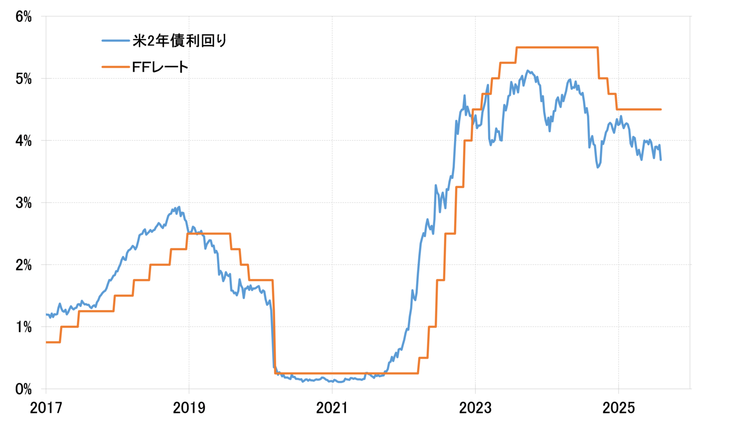 なお、トランプ政権1期目の2019年8月からFRBが「予防的利下げ」との説明で利下げを開始すると、利下げが始まる前に米2年債利回りは当時のFFレート誘導上限を0.7%以上下回った。