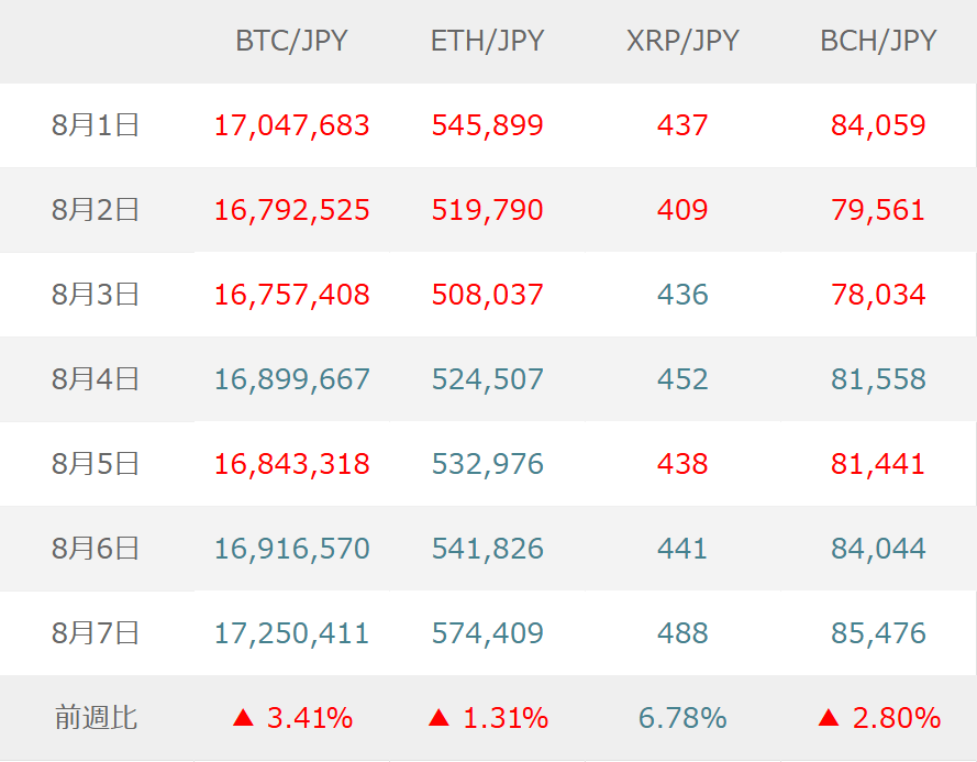 今週(8月1日~8月7日)の相場動向