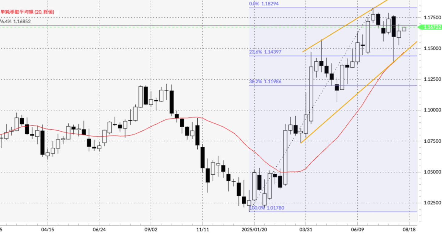 先週(8月4日週)のユーロ/米ドルは、前週に大きく下げた動きに対して調整が入り、週半ばまでじり高の流れを続けました。8月7日には1.16984ドルの高値をつけましたが、1.17ドル超えにはユーロ売りのオーダーも並んでいたこともあり、それ以降週末までは1.16ドル台半ばでのもみあいを続けました。