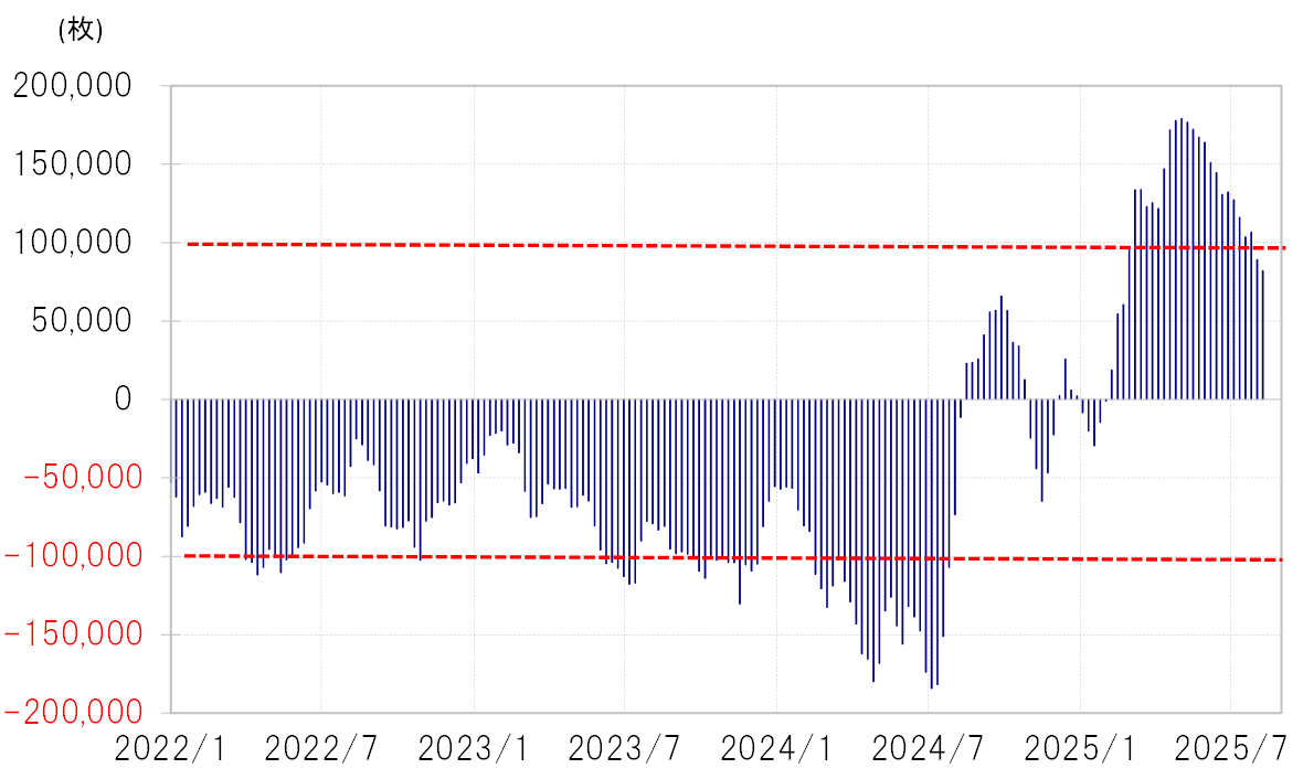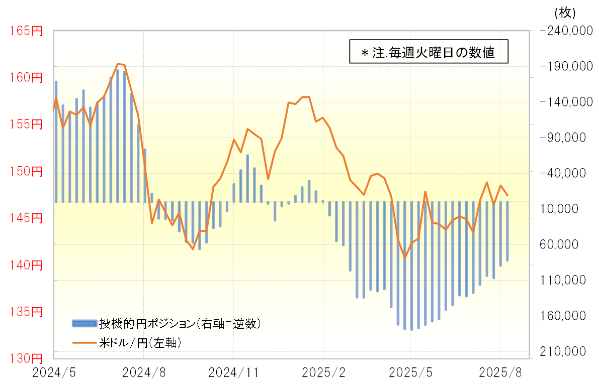 ヘッジFの取引を反映するCFTC(米商品先物取引委員会)統計の投機筋の円ポジションは、買い越し(米ドル売り越し)が2025年4月29日時点の17.9万枚という過去最高から、8月5日時点では8.2万枚まで縮小した(図表1参照)。空前の円買いポジションは3ヶ月でほぼ半減した。
