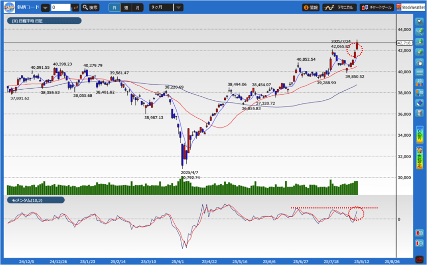 3連休明けの8月12日、東京市場は大幅高となり、前週末のTOPIXに続いて日経平均株価も過去最高値を更新して取引を終えました。米中の関税交渉への警戒が一旦和らいだことが株価を押し上げた1つの要因ですが、テクニカル的にも理由が挙げられます。