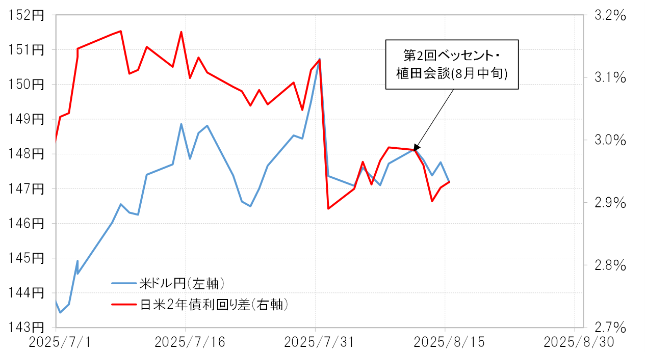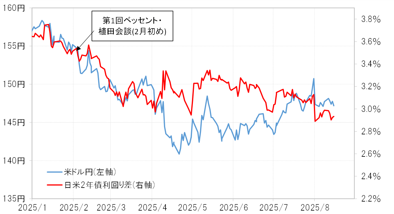 ただその後、ベッセント財務長官からFRB(米連邦準備制度理事会)への利下げを期待する一方で、日銀には逆にインフレ対策として利上げへの期待を表明したことから、日米金利差(米ドル優位・円劣位)縮小で、一時146円台前半へ米ドル安・円高となる場面もありました(図表2参照)。