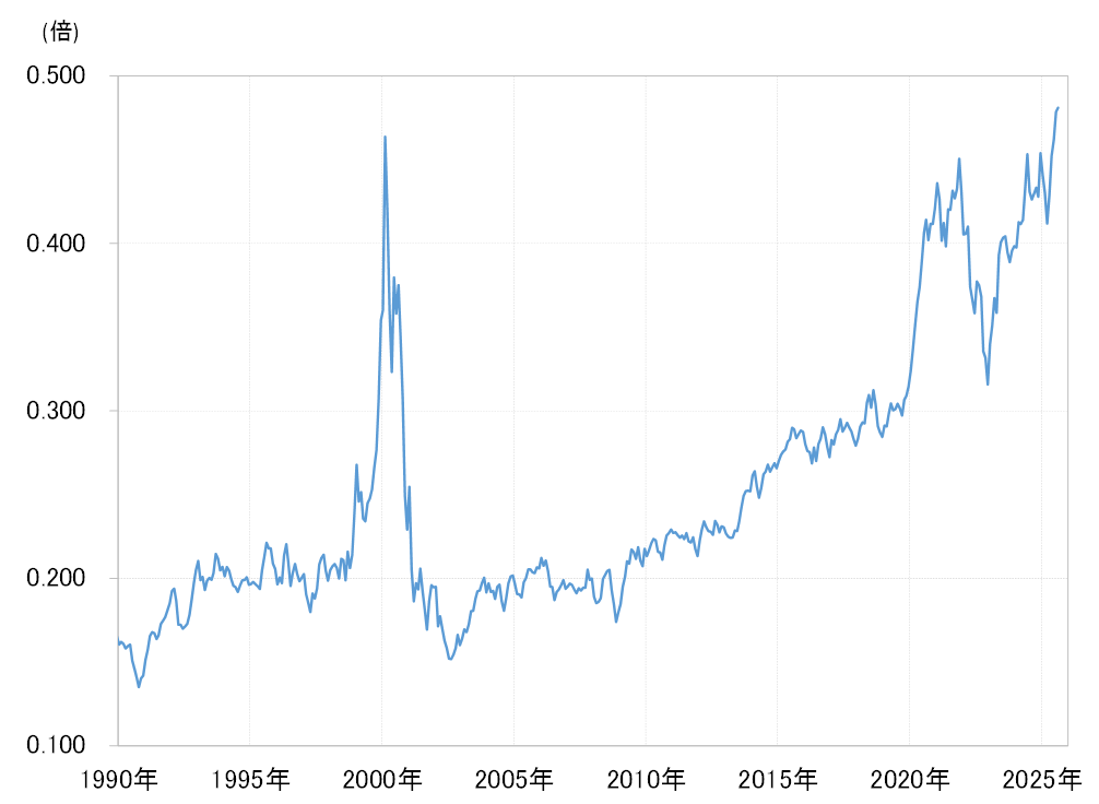 最近にかけて日米などの株価急騰が見られ、とくに米国株にはテクニカルに「上がり過ぎ」の懸念もあります。とくにナスダック総合指数のNYダウに対する割高感は、2000年のITバブル以上に拡大してきました(図表6参照)。このような米国株が、米早期利下げ再開のテーマにどのように反応するかも個人的には注目しています。