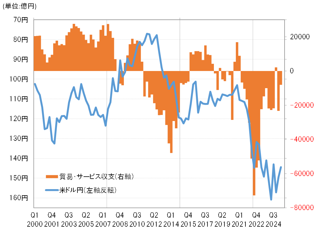 それは、2023年以降、貿易・サービス赤字が縮小し、収支が改善する中でも円安傾向が続いたことでも再確認できるだろう。では、日本経済衰退化を示すとされた貿易・サービス赤字の縮小を尻目に円安傾向が続いているのはなぜか。