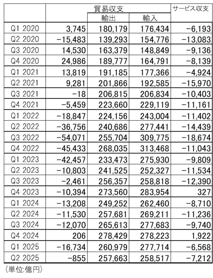 財務省が発表した2025年第2四半期の貿易・サービス収支(速報値)は8千億円の赤字となり、2024年第4四半期に小幅に黒字になった点を除き、四半期の赤字としては2021年第2四半期(6千億円)以来の小幅に縮小した(図表1参照)。貿易・サービス赤字の過去1年平均も1兆2千億円に縮小し、2021年以来の水準まで改善した。