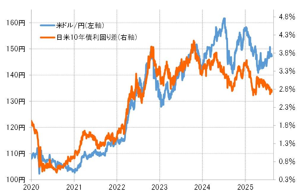 日米金利差(米ドル優位・円劣位)は、2022年以降急拡大した。世界的なインフレで米国などが大幅な利上げに動く中で、日本はいわゆる「異次元緩和」を継続したためだ。その後、米国などが利下げに転換する一方で、日本は「異次元緩和」を終了し、利上げに転換したことで、この大幅な金利差も縮小してきたが、なお2021年までの水準に比べると大幅な状況が続いている(図表3参照)。