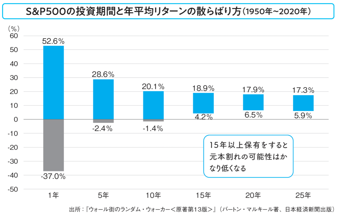 また、投資の名著とされる『ウォール街のランダム・ウォーカー』(バートン・マルキール著、日本経済新聞出版)では、分散された株価指数の例として「S&P500」に15年以上投資した場合、1950~2020年のどの期間においても元本割れしないという分析結果を紹介しています。
