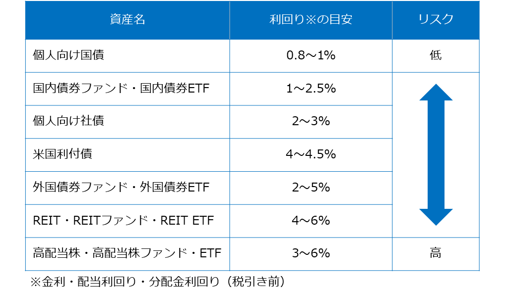 キャッシュフローが得られる金融資産はいろいろあり、目安となる金利、配当利回り、分配金利回りは異なります。図はリスクが低いものから高いものに並べたものです。