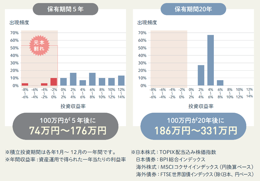積立・分散投資の期間が5年だと投資収益率はブレ幅があり、時期によっては損失が出ていることがわかります。しかし、積立・分散投資を20年行った場合は元本割れすることなく、年率2%~8%で増やせていることがわかります。