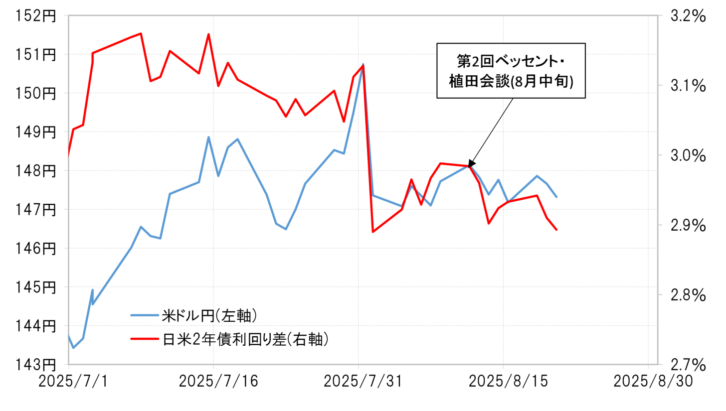 つまり、ベッセント長官や米財務省の「本音」は、150円の円安が不満であり、それを是正するために日本の金利上昇に伴う日米金利差(米ドル優位・円劣位)縮小を要求したということではないだろうか(図表2参照)。