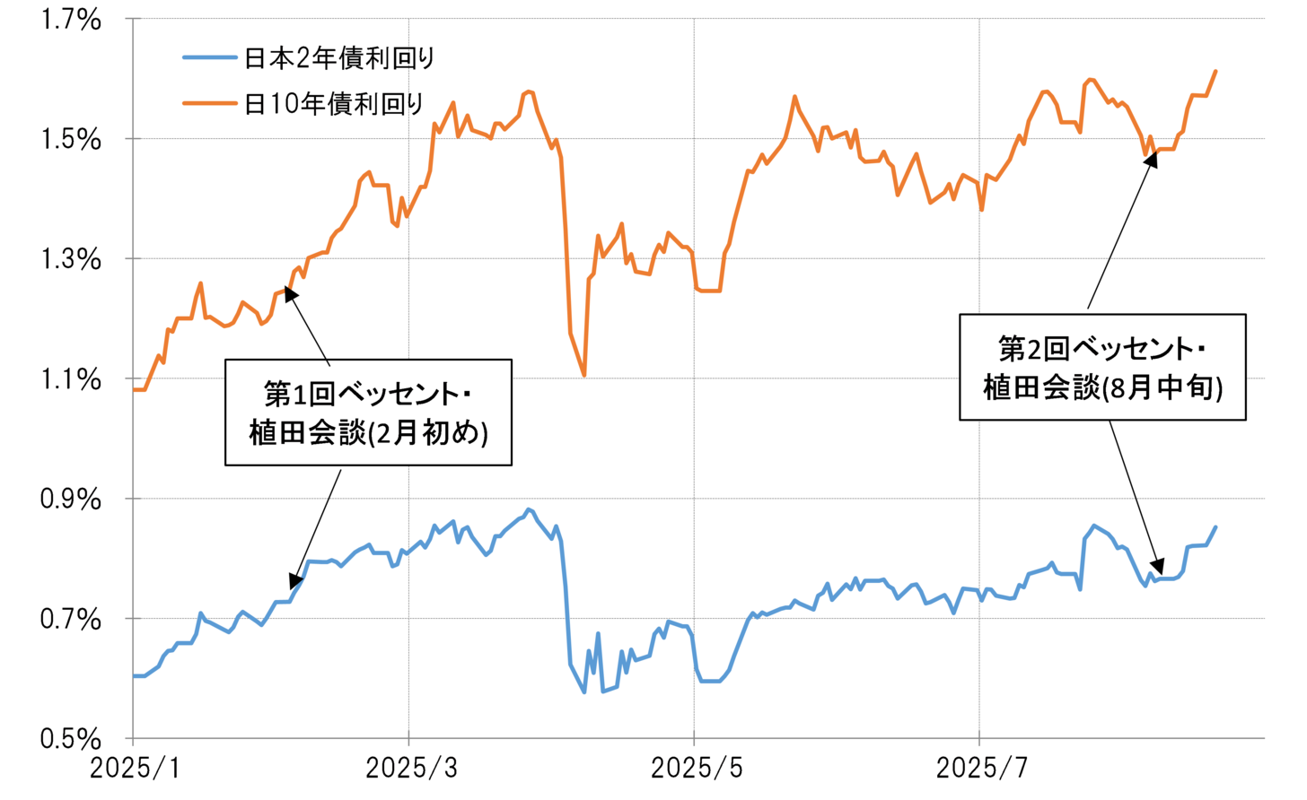 日本の金利が上昇している。10年債利回りは8月20日、1.6%を上回り、年初来の高値を更新した。また2年債利回りも3月に記録した年初来高値に接近してきた(図表1参照)。この金利上昇は、8月13日に報道されたベッセント米財務長官のインタビュー以降起こったものだった。
