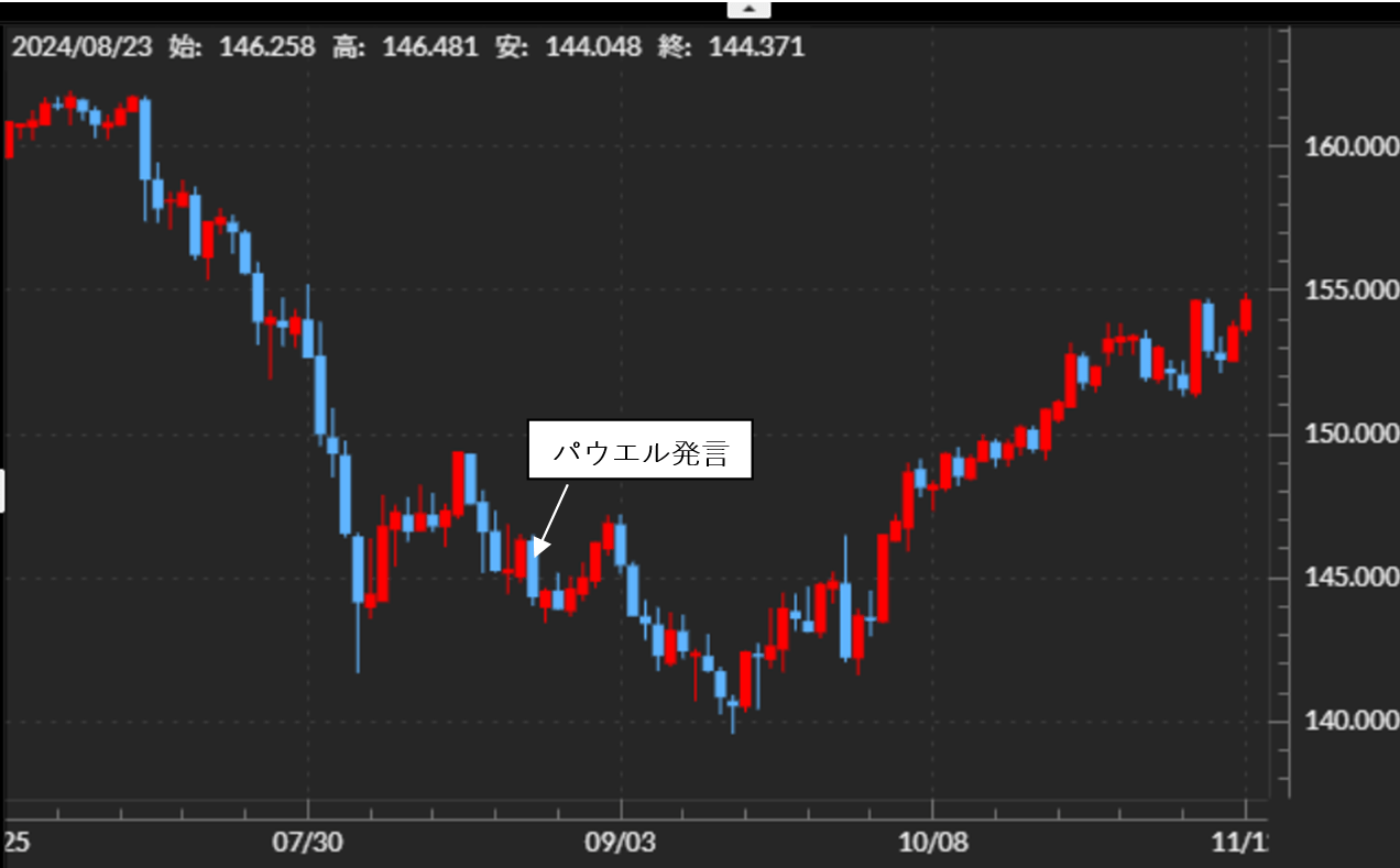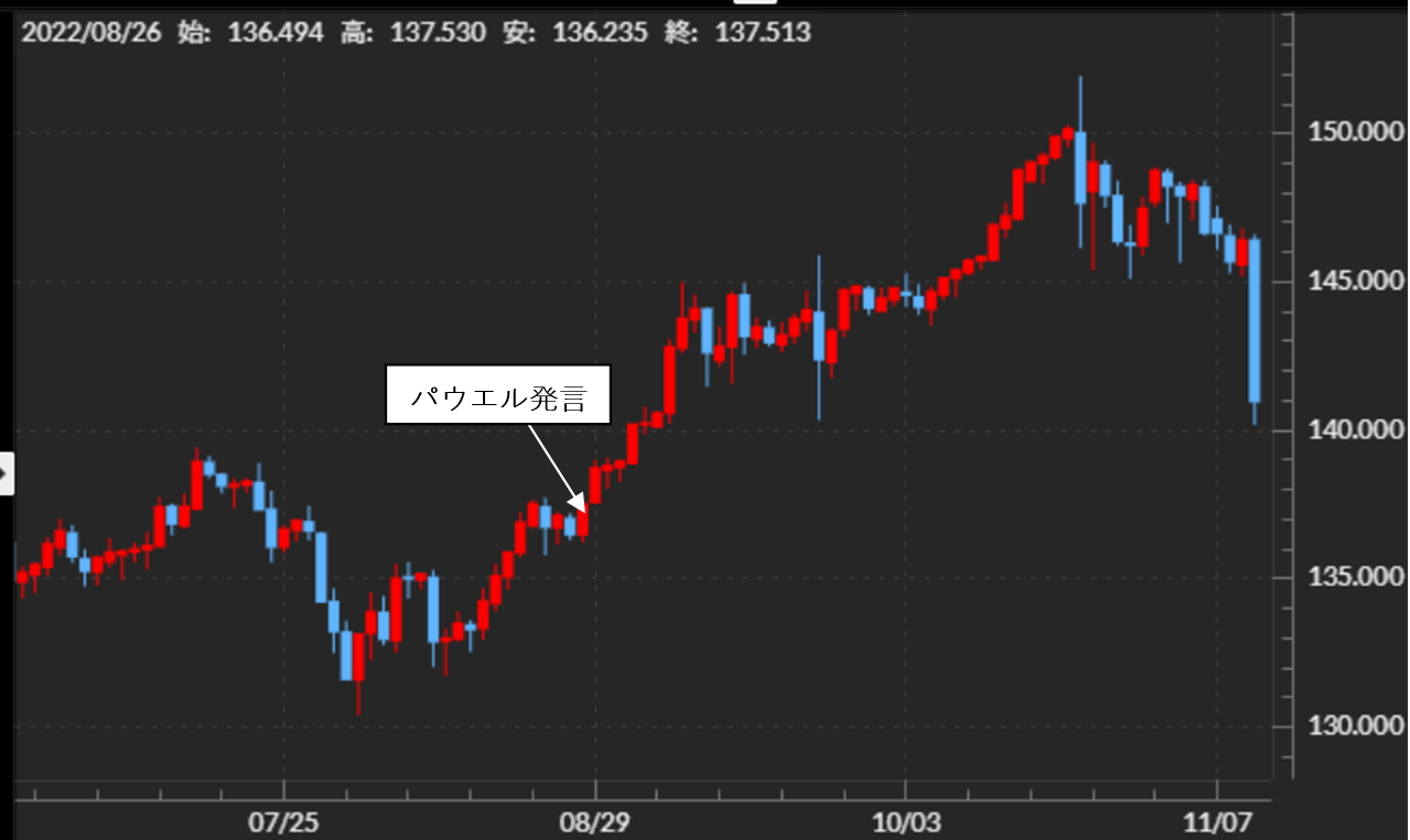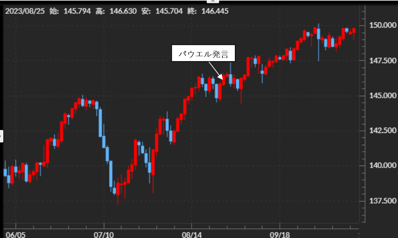 この2024年と金融政策の方向性が反対だったのが2022年だった。当時のFRBはインフレ対策の大幅な利上げを行っていた。その上で8月ジャクソンホール会議の講演では、パウエル議長は「インフレ低下というにはほど遠い状況」と発言、大幅利上げの継続を示唆した。利上げという方向性が分かっていたことから「発言」前から米ドル/円は上昇していたが、大幅利上げ継続の示唆を受けて、「発言」後は一段の上昇に向かった(図表3参照)。