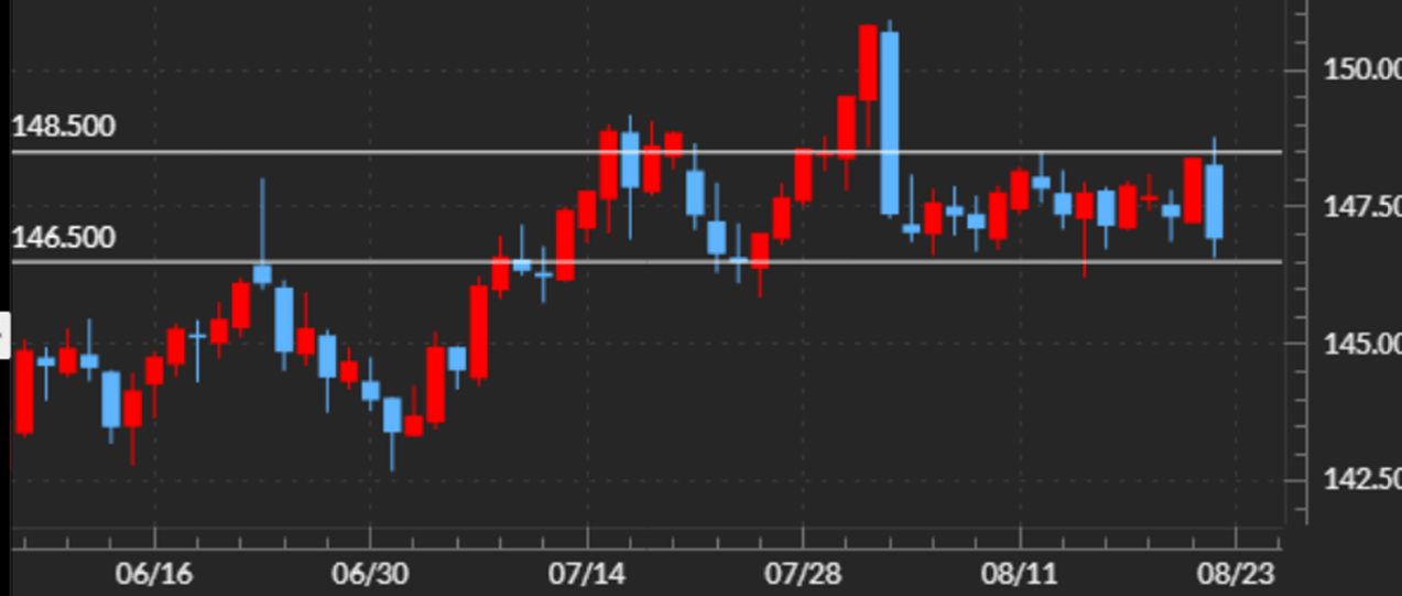 今回と同じように、パウエル「ジャクソンホール発言」前の1週間、方向感のない狭いレンジで米ドル/円の小動きが続いたのは2023年だった。この時は、「発言」後の1週間も狭いレンジでの小動きが続いた(図表1参照)。ということは、今回も「発言」後少なくとも1週間はまだ146円半ば~148円半ばのレンジ内での方向感のない展開が続くことになるのだろうか。