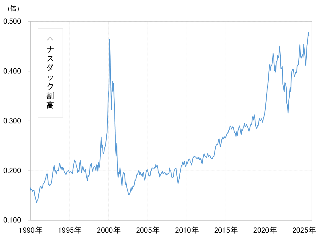 その米国株は、NYダウに対するナスダック総合指数の相対株価が2000年ITバブルを上回る割高になるなど、テクニカル的には「バブル」の懸念もあります(図表5参照)。そういった中でも早期利下げ再開などを手掛かりに米国株高が続くか否かは、米ドル安・円高の行方を左右する1つの鍵ではないでしょうか。以上を踏まえ、今週の米ドル/円は145~148.5円で予想します。