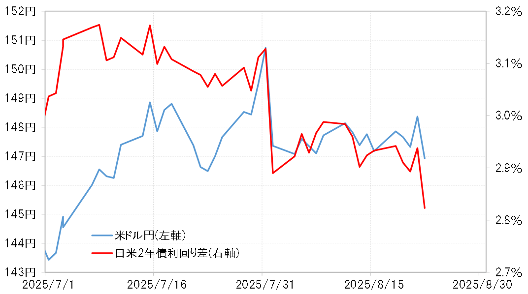 先週の米ドル/円は、22日のジャクソンホール会議でのパウエルFRB(米連邦準備制度理事会)議長の講演を意識した展開が続きました。パウエル議長講演前には、9月FOMC(米連邦公開市場委員会)での利下げを示唆しない「タカ派」発言が警戒され、米金利が上昇すると米ドル/円も148円台後半まで上昇しました。ただ、実際の発言では、慎重ながら9月利下げの可能性を確認したと受け止められたことから、米金利が大きく低下し、米ドル/円も146円半ばまで急落しました(図表1参照)。