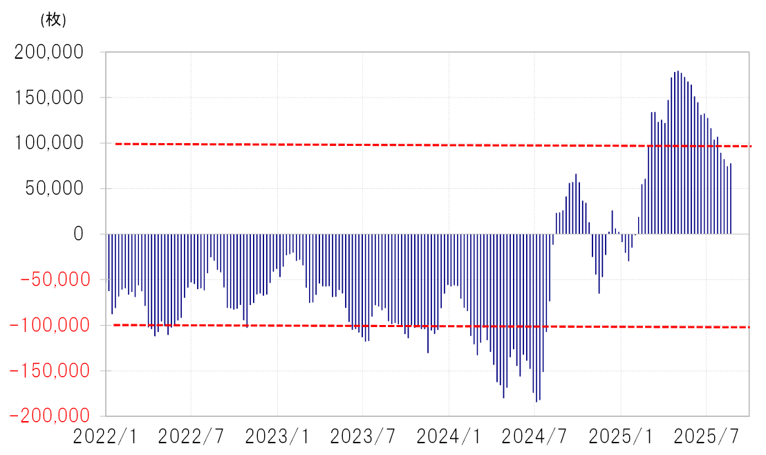 ヘッジFの取引を反映しているCFTC(米商品先物取引委員会)統計の投機筋の円ポジションは、2025年4月末には買い越し(米ドル売り越し)がそれまでの最高を大きく更新し、17万枚以上に拡大しましたが、それが8月中旬には7万枚台まで縮小しました。4月にかけて急激に進んだ円高が一服し、逆に一時150円まで円安へ戻す中で、円買いポジションの含み損が拡大した可能性があり、このため円買いポジションの処分、それに伴う米ドル買い・円売りが続いたと考えられました(図表4参照)。