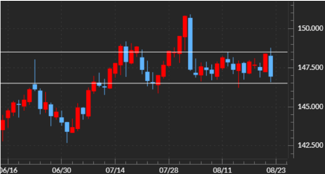 米ドル/円は、22日のパウエル議長発言を前後して上下に大きく変動しましたが、このところ続いていた146円半ば~148円半ばを中心としたレンジのブレークには至りませんでした。約2円の狭いレンジでの展開はすでに3週間と長く続いています。