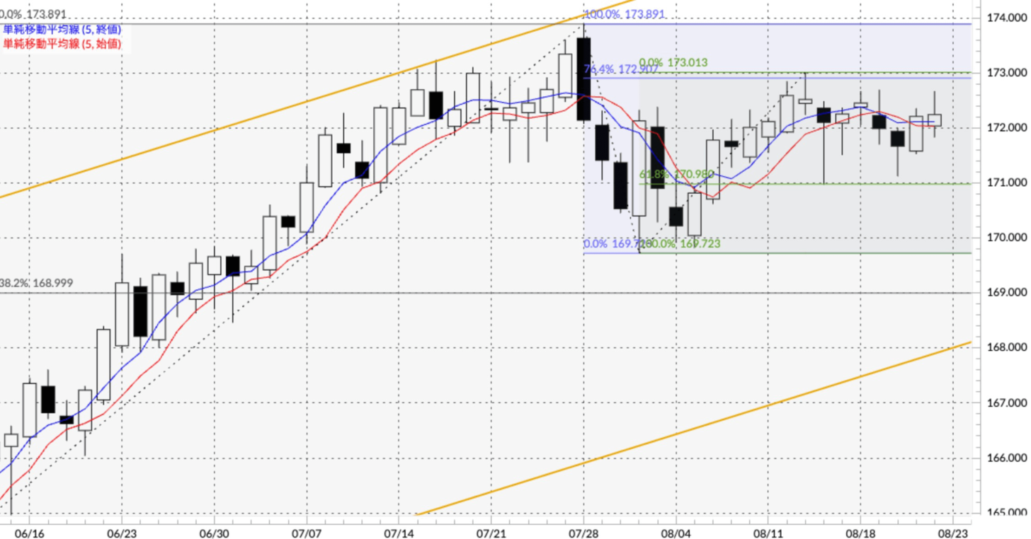 ジャクソンホール後の米ドル安の動きからユーロ/米ドルは1.17422ドルまで上伸後、やや押しての引けとなりました。先週(8月18日週)は米ドルの動きとして米ドル/円とユーロ/米ドルが似たような動きとなったこともあり、ユーロ/円は172円水準をもみあいの中心として方向感がはっきりしない一週間となりました。
