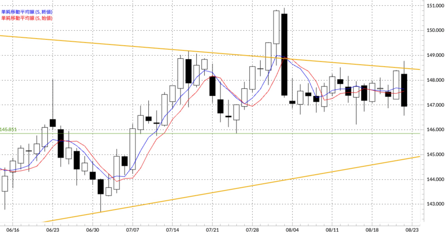 先週(8月18日週)は、ジャクソンホールでのパウエルFRB(米連邦準備制度理事会)議長講演を前に目立った材料はなかったものの、為替市場では全般に米ドルが底堅い動きとなり、米ドル/円は週初の147円台前半から議長講演前には148円台半ばへと水準を切り上げての講演待ちとなりました。