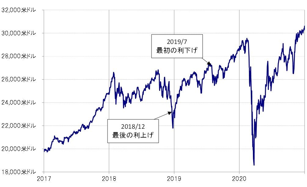 7月に最初の利下げを行った後、株価はむしろ下落した。ただ、それも半月ほどで一巡すると、その後は株高に転じ、9、10月とFOMCが追加利下げを決める中で、株価は高値を大きく更新する展開となった(図表2参照)。