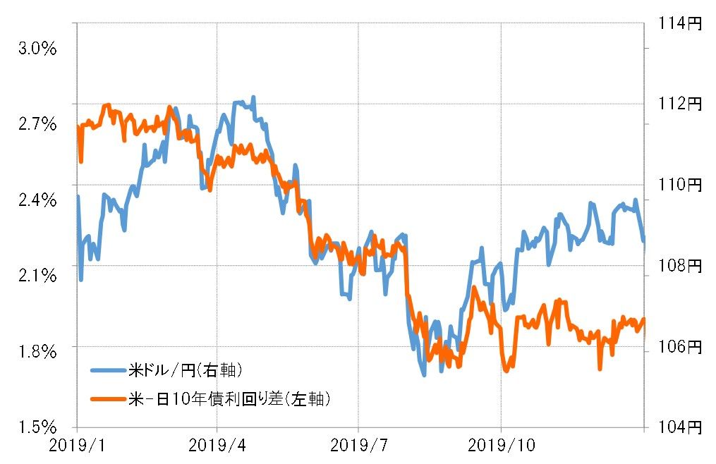 では、この「予防的利下げ」局面で、米ドル/円はどう動いたか。7月から利下げが始まり、日米金利差(米ドル優位・円劣位)が縮小に向かうと、米ドル/円もそれに沿う形で下落となった(図表1参照)。ただし、10月FOMCで3度目の利下げが行われた頃から、日米金利差から徐々にかい離する形で米ドル/円は反発に向かうところとなった。それはなぜだったのか。
