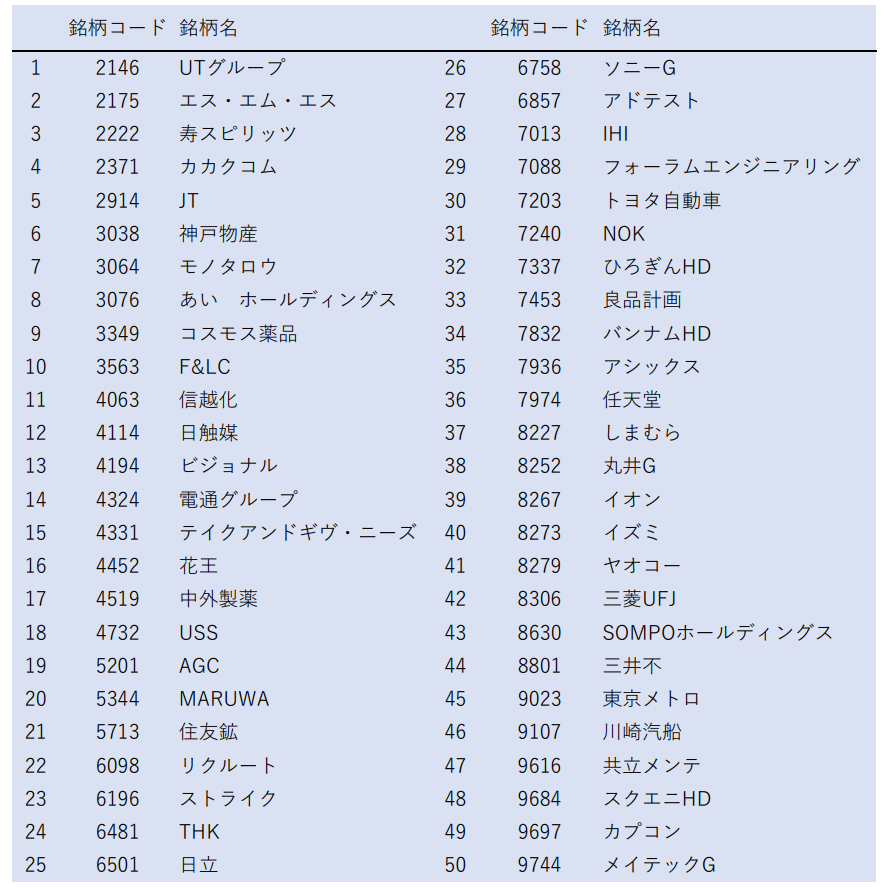 新規に組み入れる銘柄は、エス・エム・エス(2175)、中外製薬(4519)、UTグループ(2146)、ストライク(6196)、あい ホールディングス(3076)、フォーラムエンジニアリング(7088)、テイクアンドギヴ・ニーズ(4331)、川崎汽船(9107)、トヨタ自動車(7203)、SOMPOホールディングス(8630)。