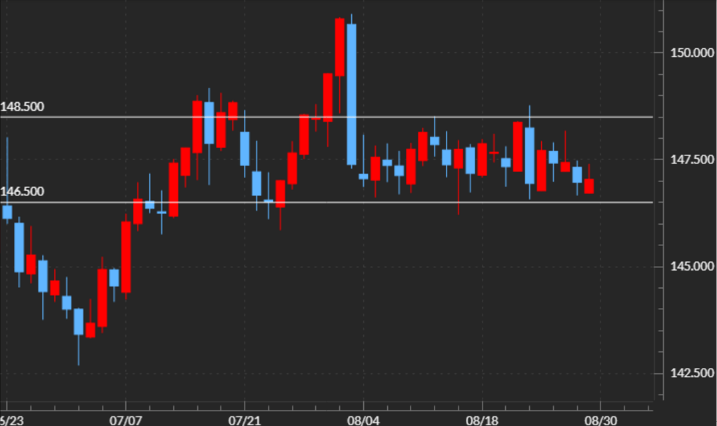 最初にも述べたように、米ドル/円は約1ヶ月も146円半ば~148円半ばの狭いレンジで方向感のない展開が続いてきた(図表4参照)。人は今見ている相場がこの先も続くと考えやすい。ただこれまで見てきたように、例年レーバーデイ前は小動きが続くことが多く、しかしレーバーデイ明けから大きく一方向へ動き出すところとなった。ということは、例年通りならレーバーデイ明けから一方向へ大きく動く相場が始まる可能性が高く、小動きが続く可能性は低いということになるだろう。