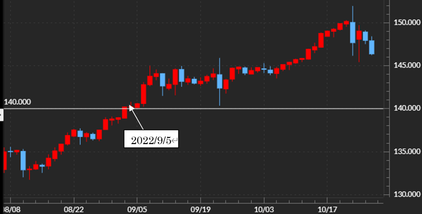 2022年の場合は、レーバーデイ明けから140円の大台を完全に突破すると一気に145円に迫る動きとなった。ここで当時の神田財務官が、米ドル売り介入の可能性をこの局面で初めて強く警告したことから、一旦米ドル高・円安には急ブレーキがかかった。ただ約2週間後に145円を超えて米ドル高・円安が広がると、ついに2011年以来となる日本の通貨当局による為替介入が実現するところとなった(図表2参照)。