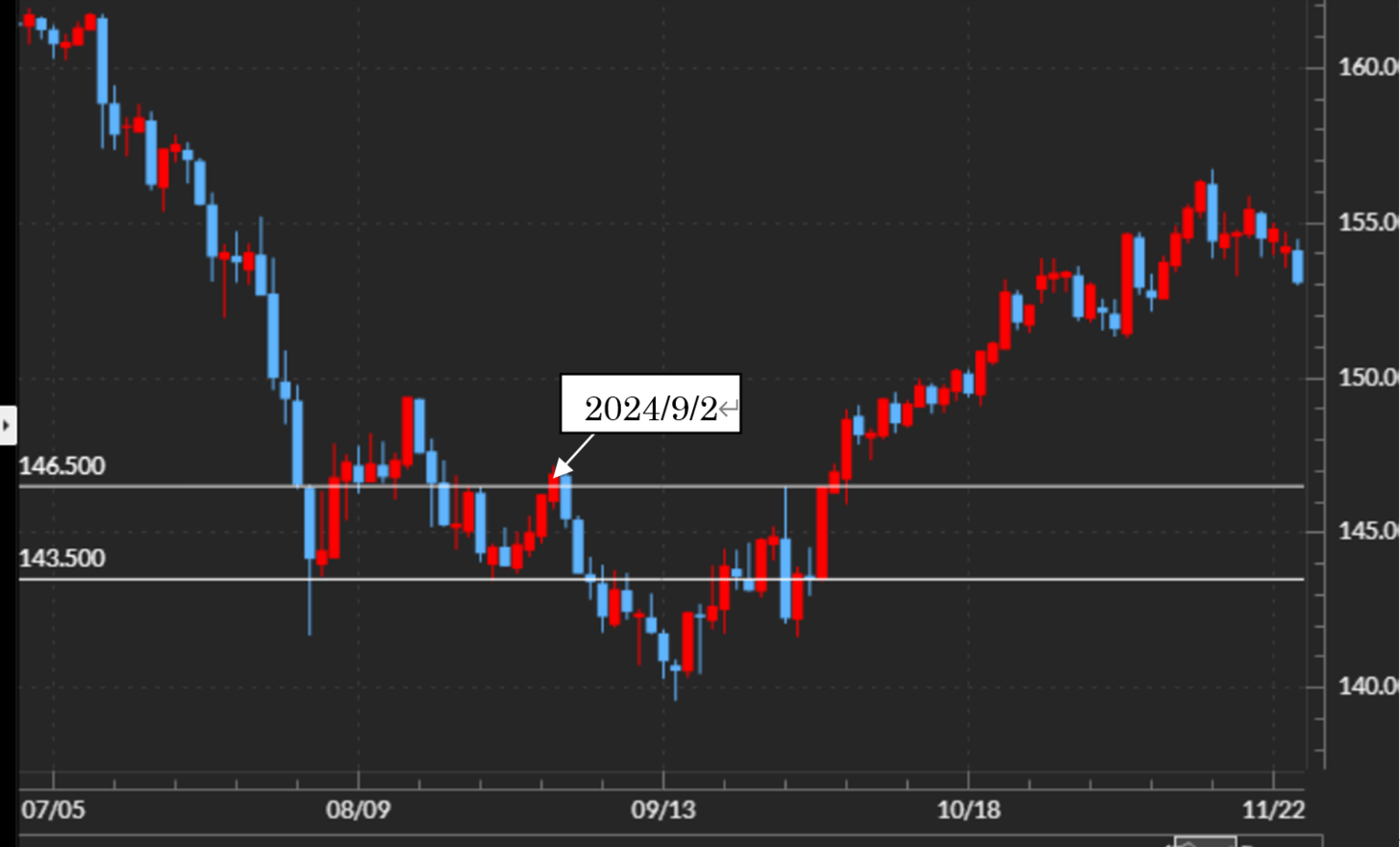しかし急激な円高も8月半ば以降は一服となっていた。レーバーデイ前の2週間、米ドル/円は143円半ば~146円半ばでの方向感のない一進一退が続いた。ところがレーバーデイ明けから米ドル安・円高が再燃、それまでの米ドル安値の141円を割り込むと139円まで米ドル安・円高が広がるところとなった(図表3参照)。