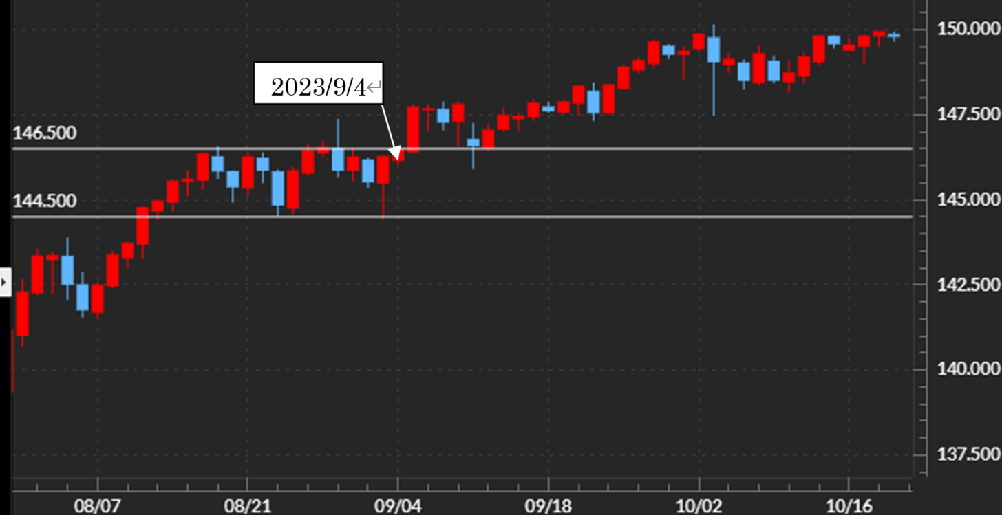 2023年の場合は、レーバーデイ以前の約3週間、米ドル/円は144円半ば~146円半ば中心の方向感のない展開が続いていた。しかしレーバーデイ明けからは、このレンジを米ドルは上放れ、そのまま10月にかけて前年に続き2年連続で150円の大台トライに向かった(図表1参照)。
