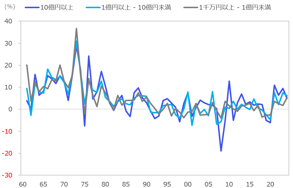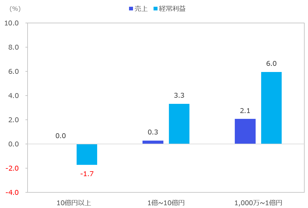 資本金レンジごとに売上・経常利益を比較すると、大企業が(資本金10億円以上)が伸び悩んだことがわかります。対照的に中堅(1億~10億円)・中小(1,000万~1億円)は、売上は小幅な増収であるものの、利益は確保した様子がうかがえます。