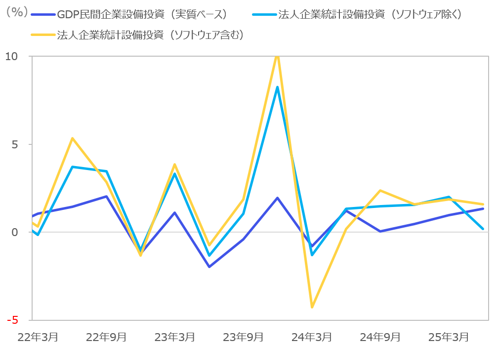 ソフトウェアを除く設備投資(図表5、水色)は、前期比0.2%増と前の期の1~3月期から伸びが減速しました。本指標はGDPの2次速報にて用いられることから、堅調であったGDPの設備投資も修正が入る可能性が指摘できます。ソフトウェアを含む設備投資(図表5、黄色)は、前期比ベースでは若干の減速が見られた一方で堅調さがうかがえます。外部環境の不確実性が高まる中で、企業は比較的内部への投資といえるソフトウェア投資にシフトしたと推察されます。設備投資は、トランプ米政権に振り回された4~6月期も底堅い内容となり、徐々に不確実性の霧が晴れていけば、上昇基調に推移していくと考えられます。