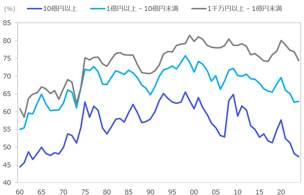 今回の法人企業統計では年度ベースのデータも公表され、最新の2024年度の付加価値額や人件費が公表されました。労働分配率とは、企業が生み出した付加価値(営業利益+人件費+支払利息等+動産・不動産来借料+租税公課)に対して人件費が占める割合、つまりはどれほど人件費に回したかを示す指標です。図表3をみると、2024年度も大企業・中小企業ともに労働分配率が低下する結果となりました。企業規模に比例し、労働分配率の水準に差があるものの、コロナ禍以降では規模を問わず下落トレンドがうかがえます。