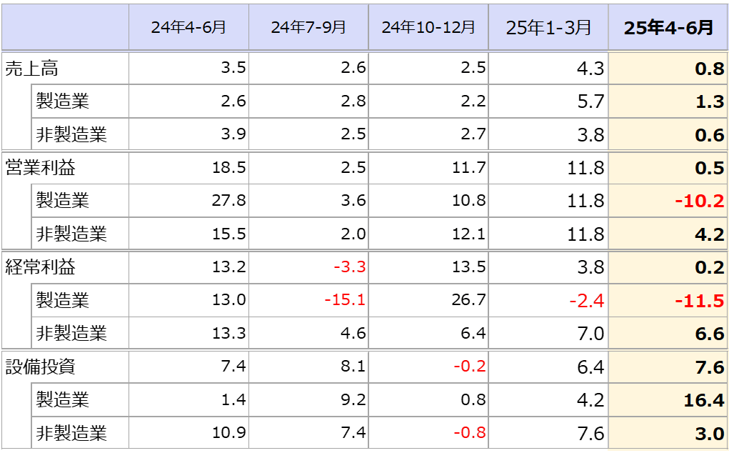 財務省が発表した四半期別法人企業統計では、2025年4~6月期の企業売上は、前年同期比0.8%増と小幅ながらプラスとなり、17期連続で拡大となりました。売上については、製造業・非製造業ともに過去1年と比較しても伸びの減速がうかがえ、利益に関しては製造業が為替影響やトランプ米政権下における通商政策が下押しに寄与し、大幅な減益となりました。設備投資は、全産業でみると前年同期比7.6%増と市場予想の同6.1%を上回り、前の期(2025年1~3月期)から伸びが拡大しました。