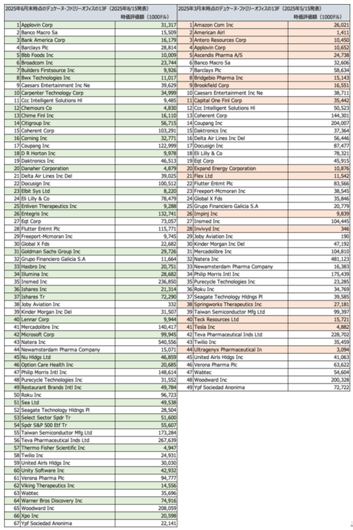 デュケーヌのフォーム13Fによると、2025年6月末時点で保有する米国上場株式数は67銘柄と、3ヶ月前(2025年3月)に比べて差し引き18銘柄増加した。アマゾン・ドットコム[AMZN]やアメリカン航空グループ[AAL]、テスラ[TSLA]を含む16銘柄を売却した一方、新たにシティグループ[C]やゴールドマン・サックス[GS]などの金融株を取得した。またハイテク関連では、マイクロソフト[MSFT]を20万株、ブロードコム[AVGO]8万株を買い入れた。