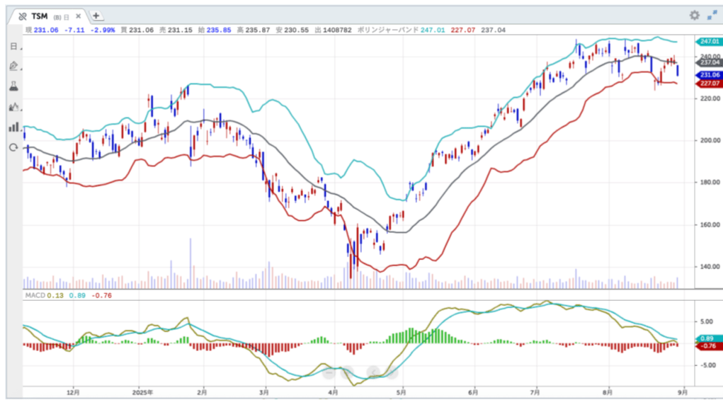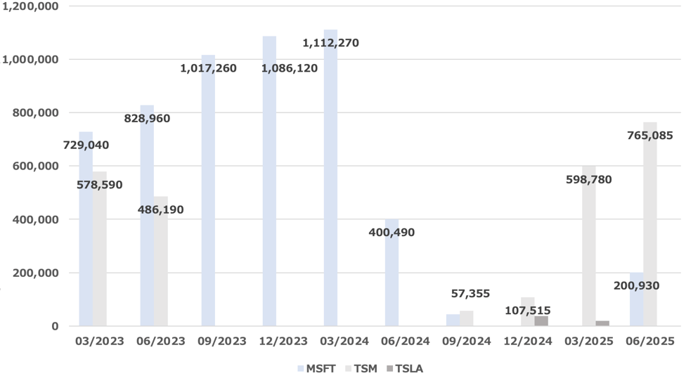 デュケーヌが半導体大手TSMC(台湾セミコンダクター・マニュファクチャリング)[TSM]の持ち高を前期末からさらに積み増したことを指摘したい。2024年12月末時点でのTSMCの保有株数は107,515株だったのに対し、2025年3月末時点の保有株数は598,780株と5.5倍余りに拡大、さらに6月末時点では765,085株と、3月末から持ち高を約16万株増やした。半年前に比べると7倍以上に拡大している。