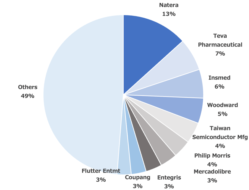 6月末時点の上場株式ポートフォリオを評価額順にまとめると、前回同様、トップはテキサス州オースティンに本拠を置く臨床遺伝子検査会社ナテラ[NTRA]、2位はイスラエルの製薬会社であるテバ・ファーマシューティカルズ・インダストリーズ[TEVA]だった。TSMCは、上場株ポートフォリオの中で5番目の評価額だった。