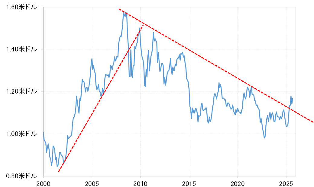 そうした変化の兆しが、2025年のトランプ政権誕生から出てきたことをこれまで見てきた。それは普通に考えたら、トランプ政権の政策に対する不信感が、基軸通貨米ドルの信認低下をもたらすことで、ユーロ高・米ドル安に大きく動く可能性が試されているという意味ではないだろうか。