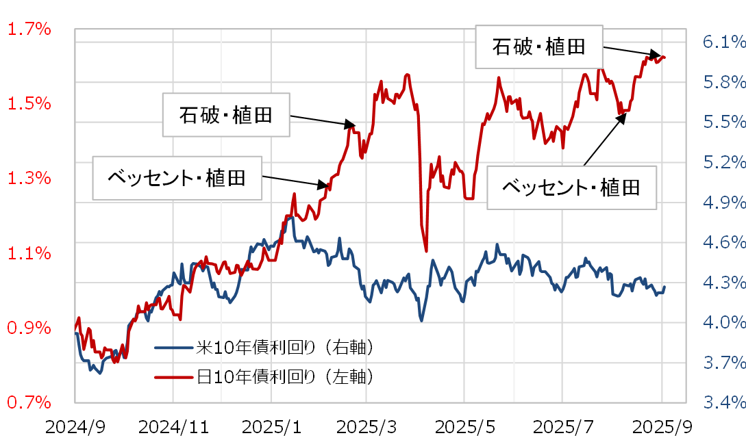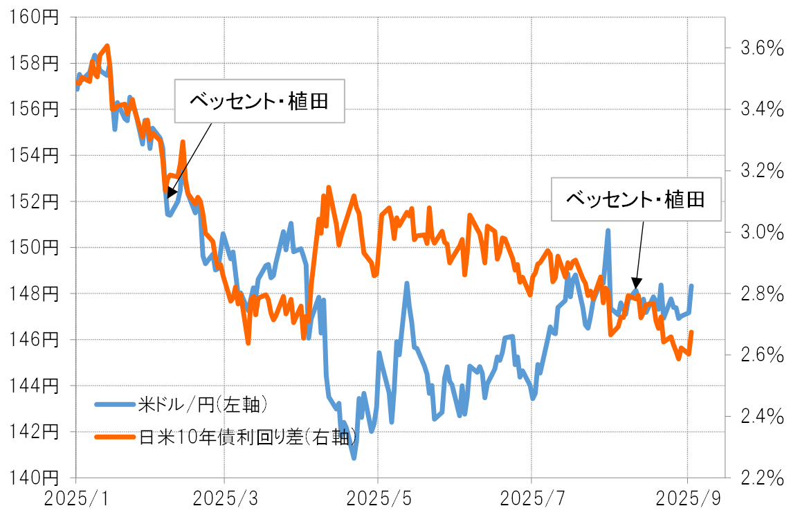 9月3日に行われた石破・植田会談も秘密裏ではなく公然と行ったのは、会談自体をむしろアピールしたかったのが本音だと考えられる。目的はマーケットに円安是正のための日銀早期利上げ思惑を浮上させる狙いだったのではないか。場合によっては、ベッセント長官からのアドバイスによるものだったかもしれない。以上のように見ると、その目的はやはり円安のけん制という可能性がありそうだ。