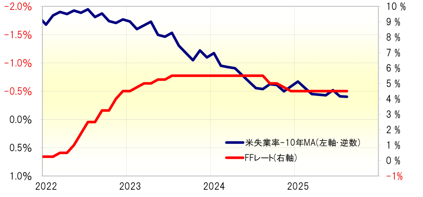 FFレートと米失業率の間には、失業率が上昇するとFFレートは低下するという一定程度の逆相関関係がある。この相関関係は、失業率から失業率の過去10年平均値を引いて求めた修正値にするとより高まる。例えば、FOMCは2024年9月から利下げを開始、この最初の利下げ幅は0.5%の大幅なものとなったが、失業率修正値はその前に大幅に上昇し、大幅利下げの可能性を示唆していた(図表1参照)。