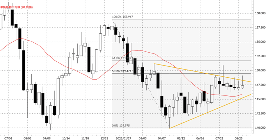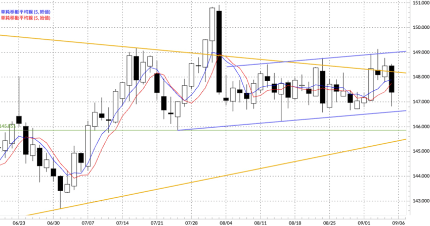 週足チャートでは、先週(9月1日週)も米ドル高の流れ、7月28日週のトンカチ(上ヒゲが長く実体が短い)以降の上値が重たい流れともに変化はありません。トライアングル(黄色)の中でレジスタンスが効いている点が長期テクニカルでは最も気にしておくべき点だと考えます(図表1)。ただ週明けの円安の動きで今週(9月8日週)もこのレジスタンスラインを試す流れで始まりました。今週末の終値がどの水準で引けるのか、重要な節目になってきました。