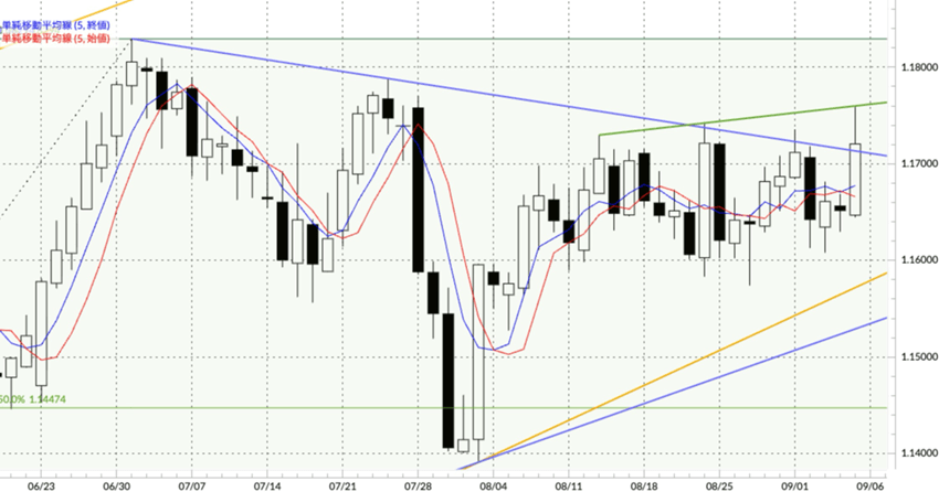 先週(9月1日週)のユーロ/米ドルは、基本的に米ドル/円と同じような動きをたどりました。9月2日の米ドル買いの動きでユーロ売りの動きとなり、翌9月3日に週間安値となる1.16081ドルをつけた後は買い戻し、米国雇用統計を1.16ドル台後半で迎えました。