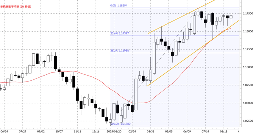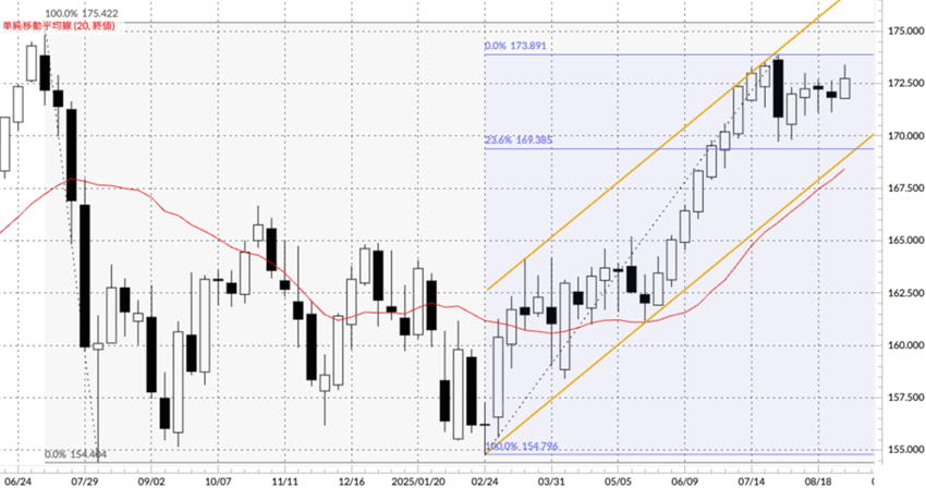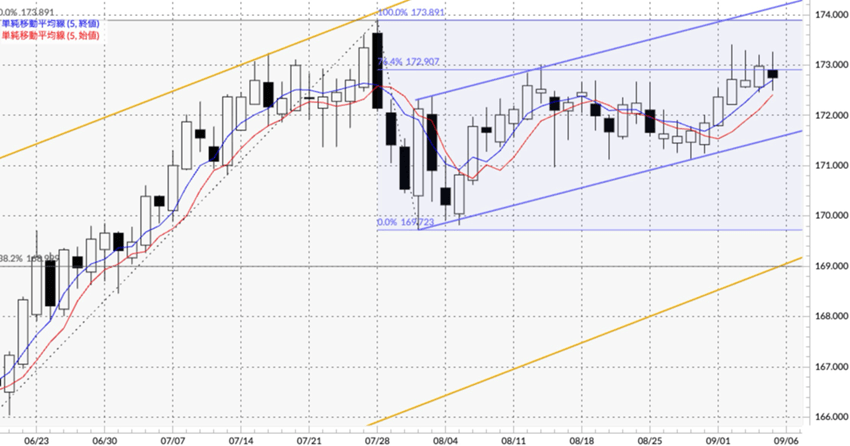 日足チャート(図表6)では8月26日のゴールデン・クロス状態を維持しており、今朝9月8日はギャップアップして始まったこともあり、175円の大台を試しやすい流れになってきたといえます。ユーロ/米ドルと違いユーロ/円は双方とも政局が流動的という同じ悪条件を持っているため、一番買いやすい通貨という見方になっているようです。ただフランスと異なり日本では自民党新総裁が新首相となる流れなので、比較的早い段階で落ち着きを取り戻すはずです。そうなると、ユーロ/円も2025年7月高値と2024年高値との間が売り場になってくる可能性も高いでしょう。