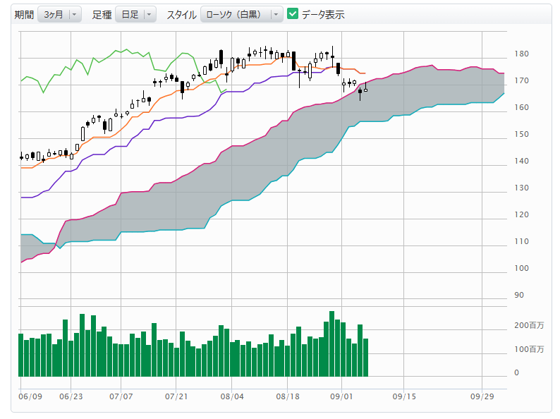 米国市場では半導体大手エヌビディアの株価が少し心配です。8月12日につけた史上最高値(184.48ドル)を8月28日の高値(184.47ドル)で超えられない状態のまま、その両者のちょうど真ん中の8月20日の安値(168.80ドル)を割り込んでしまいました(図表)。これで「ダブルトップ」が完成したことになり、短期的に調整に入る可能性が高くなってきたようです。一目均衡表でも現在値を26日前にずらして描く「遅行スパン」が当時の株価水準を下回り、「逆転」という弱気サインが確認できる状況です。